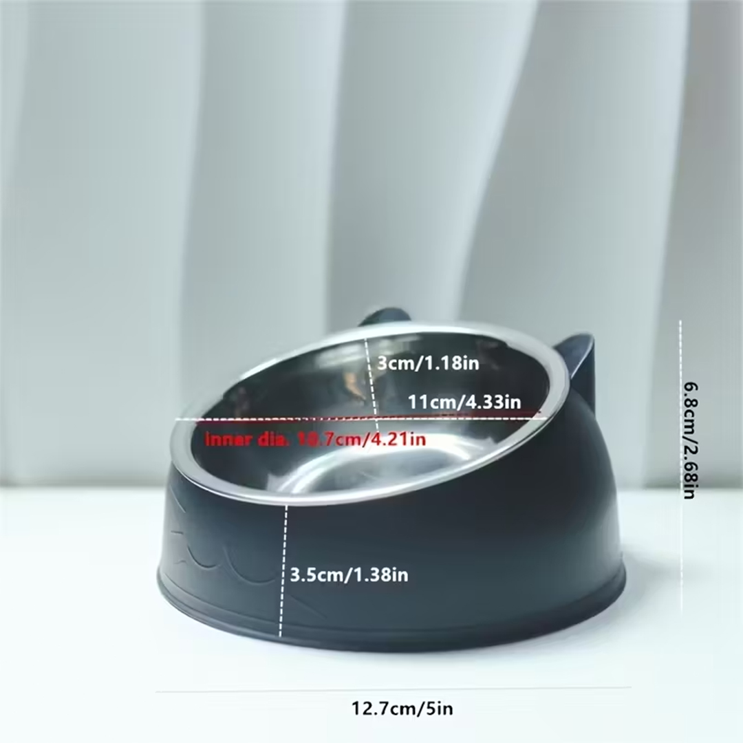 Stylová a praktická zvýšená miska pro kočky z nerezové oceli s roztomilým stojánkem ve tvaru oušek. Díky ergonomickému designu a nakloněnému tvaru chrání krk a páteř vaší kočky během jídla a pití. Kombinuje funkci misky na krmivo i vodu v jednom. Dostupná v černé barvě.
