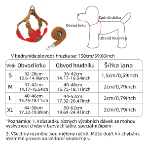 Postroj má nastavitelné popruhy, které umožňují přesné přizpůsobení velikosti psa. Součástí balení je také pevné a barevně sladěné vodítko, které ladí s designem postroje.